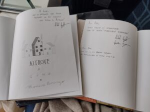 机に置かれたその本を手にとり、そばにいた著者ミケーレ・カッペッタとイラストを担当したモニカ・バレンゴと少しおしゃべりをして、息子あてにサインを書いてもらいました。